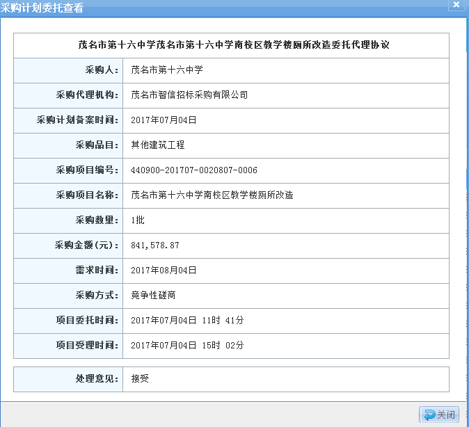 茂名市智信招標采購有限公司 受 茂名市第十六中學 的委托,擬對 茂名市第十六中學南校區(qū)教學樓廁所改造 進行競爭性磋商,歡迎符合資格條件的供應商參加。本項目將優(yōu)先確定符合相應資格條件的自主創(chuàng)新產(chǎn)品、節(jié)能產(chǎn)品、環(huán)保產(chǎn)品供應商參加談判。
