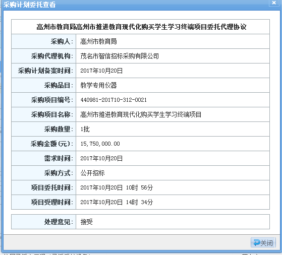 茂名市智信招標采購有限公司 受 高州市教育局的委托,對 高州市推進教育現(xiàn)代化購買學生學習終端項目 進行公開招標采購,歡迎符合資格條件的供應商投標。