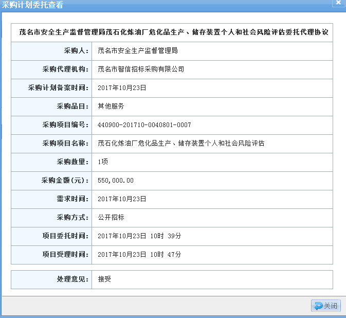 茂名市智信招標(biāo)采購有限公司 受 茂名市安全生產(chǎn)監(jiān)督管理局的委托,對 茂石化煉油廠?;飞a(chǎn)、儲存裝置個人和社會風(fēng)險評估 進(jìn)行公開招標(biāo)采購,歡迎符合資格條件的供應(yīng)商投標(biāo)。