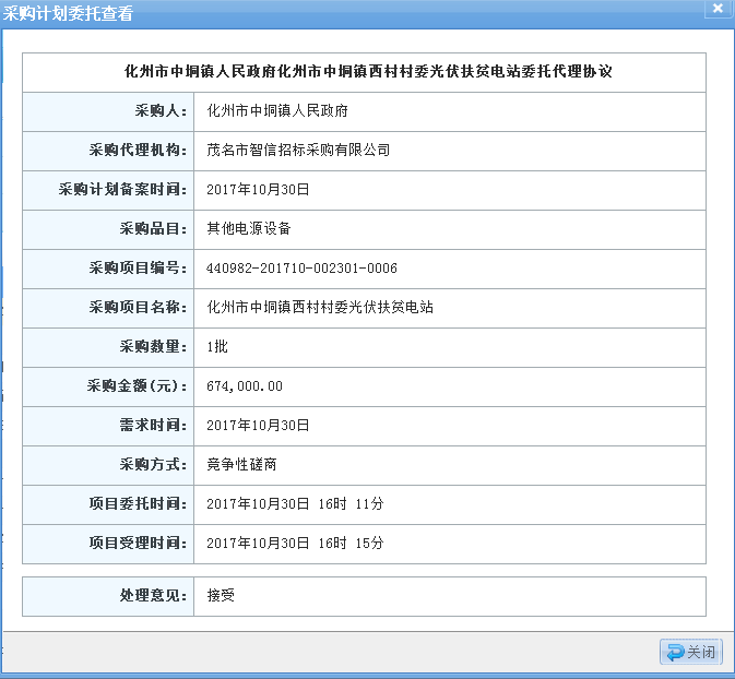 茂名市智信招標(biāo)采購有限公司 受 化州市中垌鎮(zhèn)人民政府 的委托,擬對 化州市中垌鎮(zhèn)西村村委光伏扶貧電站 進(jìn)行競爭性磋商,歡迎符合資格條件的供應(yīng)商參加。本項(xiàng)目將優(yōu)先確定符合相應(yīng)資格條件的自主創(chuàng)新產(chǎn)品、節(jié)能產(chǎn)品、環(huán)保產(chǎn)品供應(yīng)商參加談判。